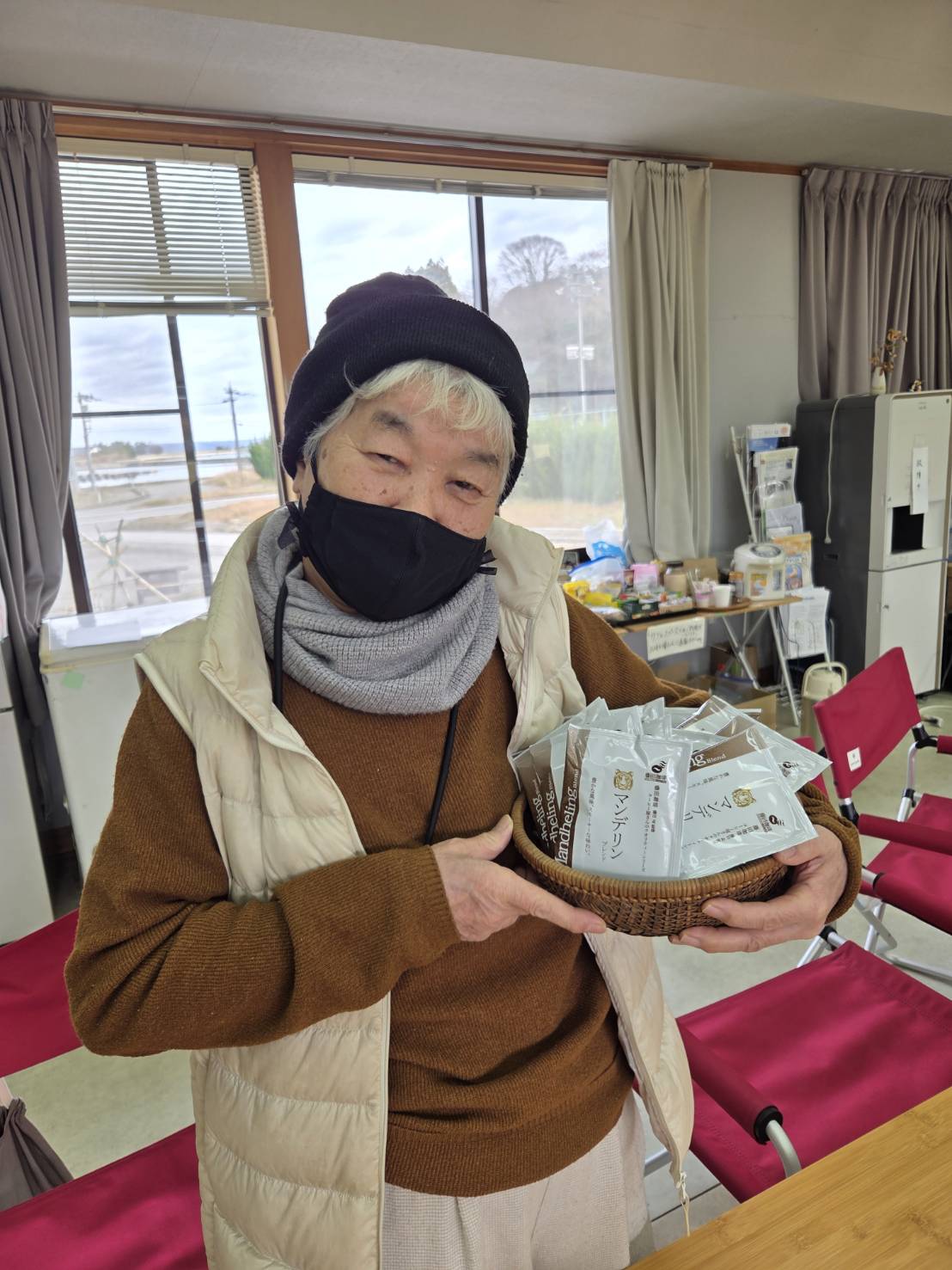 1月8日は仮設住宅にて、一社)おもやいを通して大阪の藤田珈琲さんからご寄付いただいた珈琲・・・令和6年(2024年)能登半島地震救援ニュースNo.146